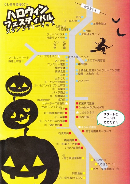 10月25日(土)上町地区商店街で「うわまち浪漫 ハロウィンフェスティバル2014」が開催されます。 PM2:00〜5:00にハロウィンコスチュームでマップのお菓子引き換え店に行くとお菓子がもらえます。 はるかぜ書店でスタンプラリーのシートをもらい商店街を回ってスタンプをあつめるとさらにお菓子セットがもらえます。 お菓子がもらえるお店はマップを見てください。 商店街ではゲームができる子ども広場や中里通りの銭湯跡ではハロウィングッズが作れるワークショップが行われます。 ハロウィンの仮装で上町商店街で楽しんでください。