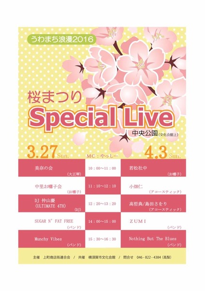 今年も恒例の上町の春のイベント「うわまち浪漫 桜まつり」が近づきました。 今年は3月27日(日)〜4月3日(日)の開催です。 メイン会場の中央公園は3月27日・4月3日の日曜日の開催となります。 (今年は土曜日の開催はございません) 10:00〜16:30の開催で音楽イベントや各種飲食・物販模擬店もたくさん出店いたします。 会場ではディズニーチケットが当たる”チッケッタ!”や4月3日13:00〜健康増進やダイエットにも良い”ノルディックウォーク”も開催されます。 期間中、横須賀市文化会館3Fギャラリーでは関東学院大学福田ゼミナールの学生さんが取材・作成した上町商店街の個店紹介ポスターの展示と”うわまちの原風景」田渕宏治遺作展と上町懐かし写真の展示を行います。 4月1日14:00〜横須賀市文化会館中ホールにおいて関東学院大学の学生さんと上町商店街店主との”上町について”のパネルディスカッションを開催いたします(入場無料・先着200名様)。 4月2日は中里通り旧当世館〈銭湯跡)では”桜のビュンビュンコマ作り”のワークショップを行います。 期間中、上町商店街ではお買い物でスタンプを集めて素敵な景品が当たる”お楽しみスタンプラリー”を開催して各店桜と春の売り出しを行います。 ぜひ上町の商店街にお越しください。