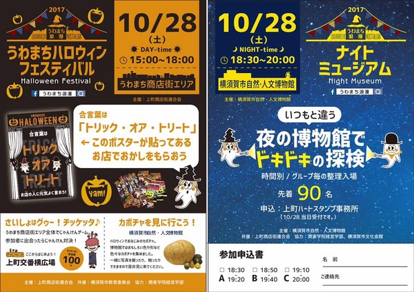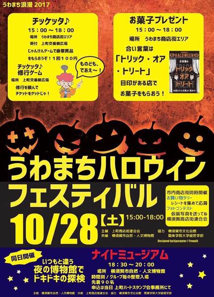 2017年のハロウィンは10月28日(土)です。 今年は盛りだくさん! 15時〜18時の商店街イベント(お菓子配布、チッケッタ♪) 18時30〜20時のナイトミュージアム(受付15時〜) の2本立て! 〇商店街イベント ・お菓子配布場所:商店街+文化会館 (お菓子配布ポスターが目印) 合言葉は“トリックオアトリート”です。 ・「チッケッタ♪」ジャンケン対決でチケット集めてディズニーペアチケットやファミコンをもらおう! (チケットは平坂上交差点、交番横で販売します。抽選も同じ場所です。) 福引所でやってる修行ゲームでチケット増やす事もできるよ! ●ナイトミュージアム 夜の博物館はドキドキがいっぱい。当日15時〜17:30ハートスタンプ事務所にて整理券配ります。先着90名(付き添いも含む)。 ぜひ仮装して上町にお集まりください。 フェイスブック「うわまち浪漫」にてイベント情報見れます。 https://www.facebook.com/uwa.shoppingstreet/