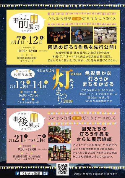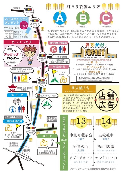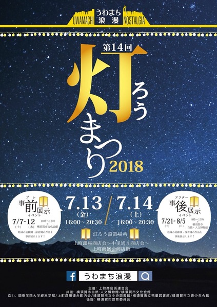 灯ろうまつりが近づいてきました。 数百の灯ろうが上町3商店街を彩ります! 屋台やステージ、お神輿展示に加え横須賀市自然・人文博物館による展示や押し花のワークショップ、中央図書館による朗読なども行います。(共に商店街空き店舗、旧Magic、旧萩原精肉店、文化会館入り口交差点近く) 日程は2018年7月13(金)14(土)の2日間、16時〜20:30です。 昨年より園児達が描いた絵が貼られている灯ろうのみの展示があります。 期日前展示 文化会館3階ギャラリー1 7月7(土)〜7月12(木)、10時〜18時。 期日後展示 横須賀市自然人文博物館、1階ホール及びラウンジにて 7月21(土)〜8月5(日)、10時〜17時。 イベント情報はファイスブック “うわまち浪漫” https://www.facebook.com/uwa.shoppingstreet/