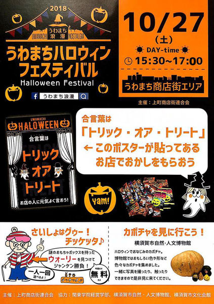 10月27日(土)うわまち浪漫ハロウィンフェスティバル開催です。 〇15:30〜17:00上町商店街と文化会館にてお菓子を用意して待ってます。 〇ミニチッケッタ♪でオモチャをGET! 赤白のウォーリーのカッコをしたおもちゃを持ったスタッフが歩いてます。じゃんけんで買ったらオモチャをもらえるよ! 〇18時からナイトミュージアム開催!自然・人文博物館にて先着120名です。 受付は15:00〜商店街のスタンプ会です。(叶不動産の道路の向かい側) 〒238-0017 神奈川県横須賀市上町2丁目3 うわまち浪漫フェイスブックページ https://www.facebook.com/uwa.shoppingstreet/?ref=bookmarks