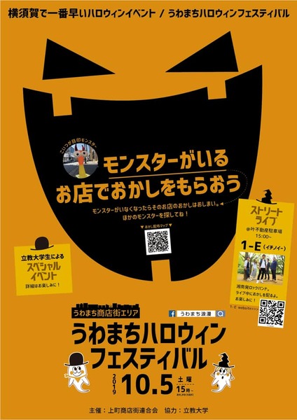 10月5日土曜日、横須賀で1番早いハロウィンを開催します! 開催時間は15時よりお菓子がなくなるまで! お菓子配布店の目印はハロウィンモンスターです。 商店街の隅々まで、探して欲してね! 叶不動産さん駐車場では、 【1−E イチノイー】さんのストリートライブ♪ 立教大学生の皆さんのスペシャルイベントブースも登場予定です。 詳しくはフェイスブックのうわまち浪漫のページにてご確認下さい。 https://www.facebook.com/uwa.shoppingstreet/